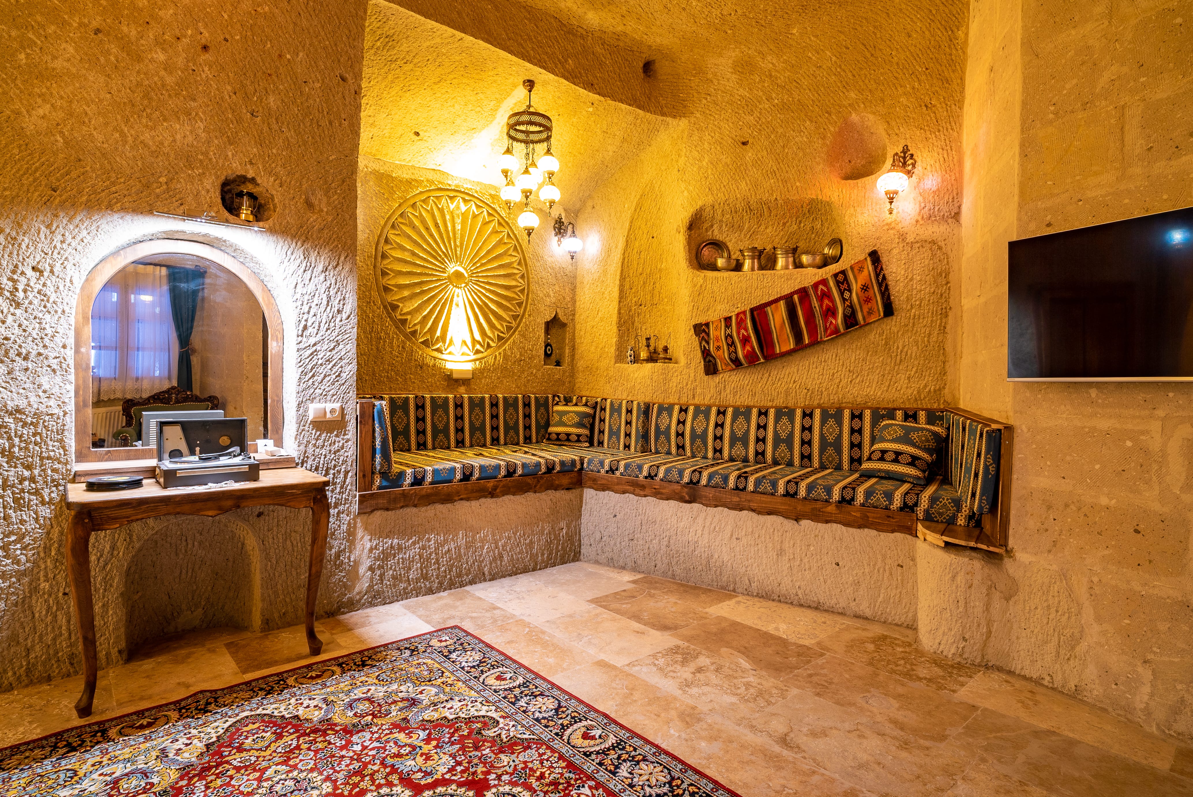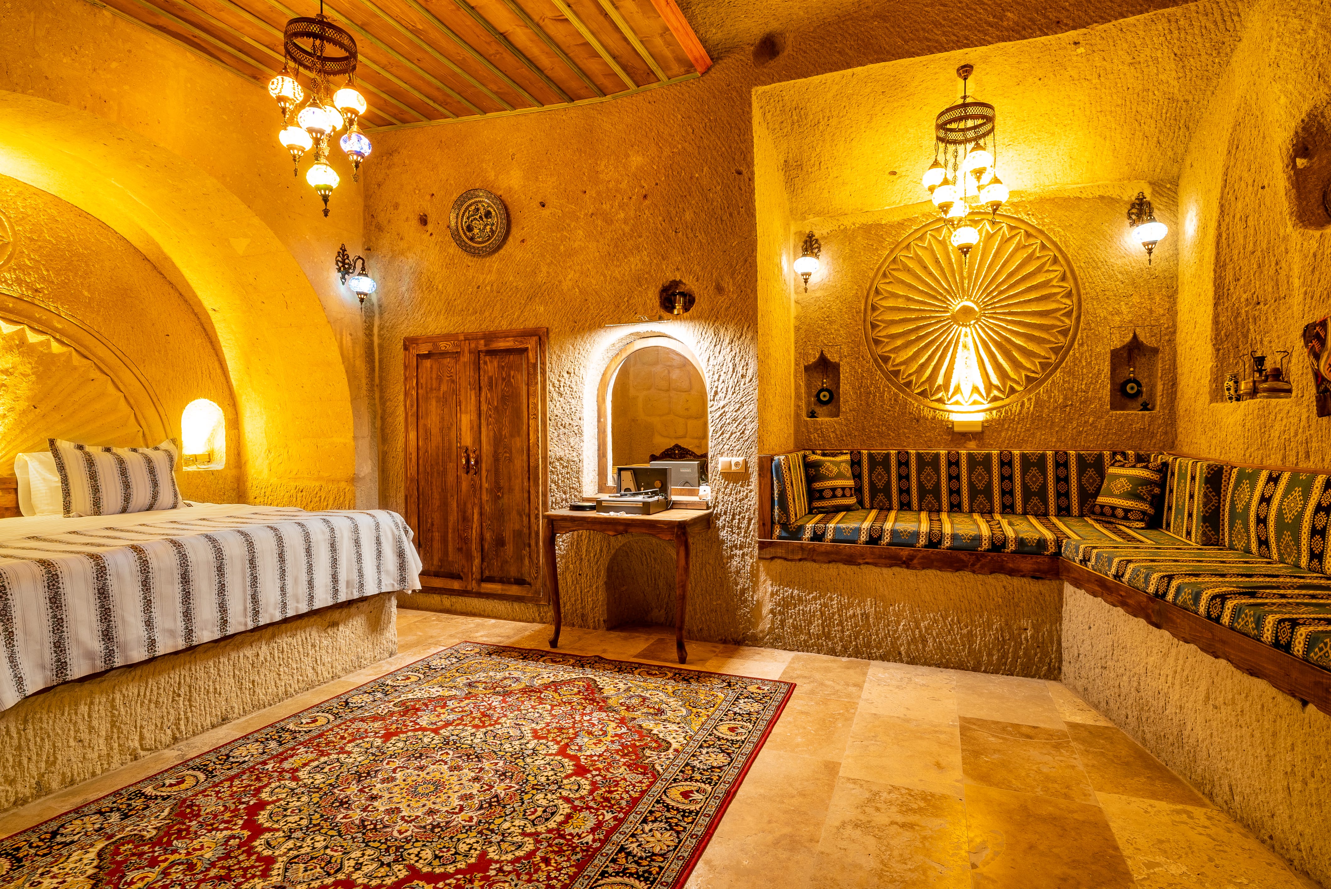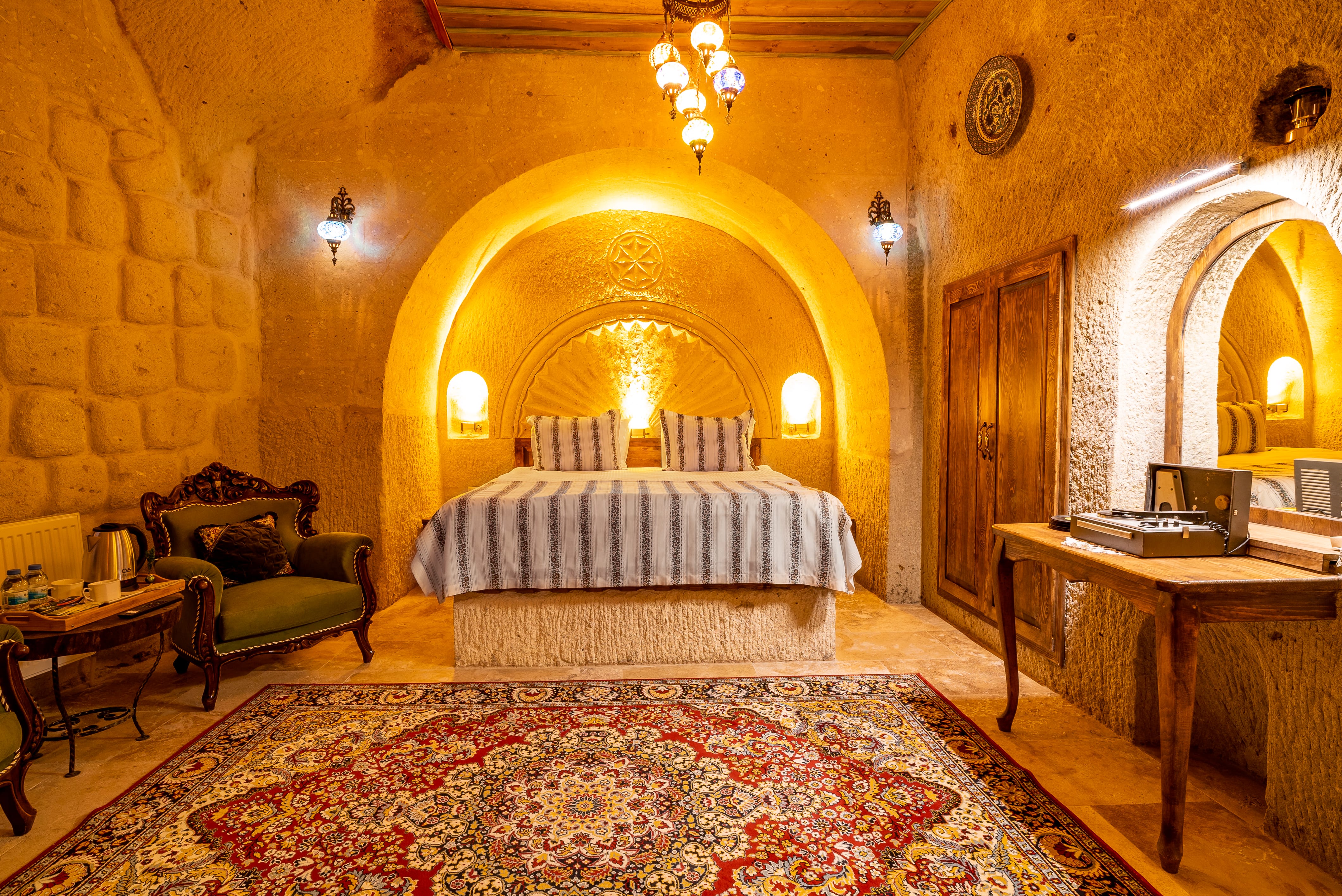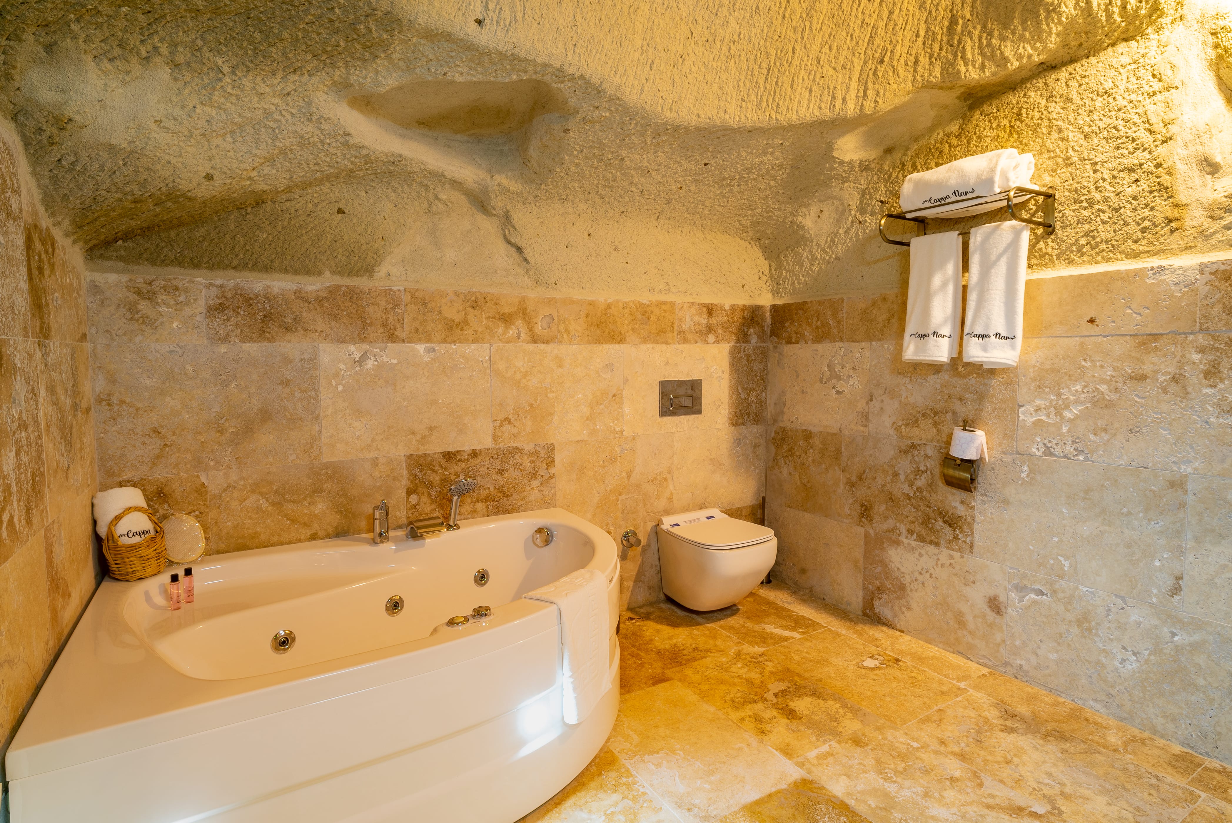Kaya oyma yapının doğal serinliği ve sessizliği günün yorgunluğunu unuttururken, jakuzili banyosu konaklamaya rafine bir dokunuş katar. Romantik anlar ve kendine zaman ayırmak isteyenler için tasarlanmış zarif bir mağara süittir.